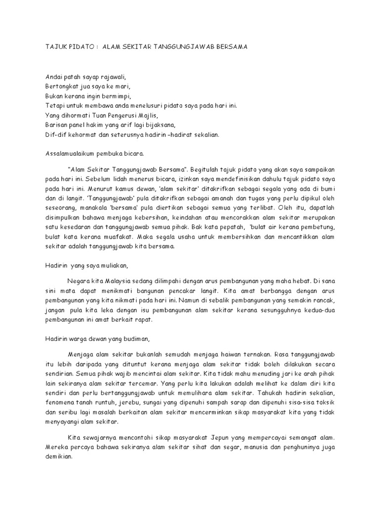Pidato Tentang Lingkungan Lingkungan merupakan tempat yang sangat penting untuk kehidupan manusia Oleh sebab itu menjaga lingkungan merupakan kewajiban setiap manusia. Manakala alam sekitar pula bermaksud dunia atau bumi. AJUK ALAM SEKITAR TANGGUNGJAWAB BERSAMA.