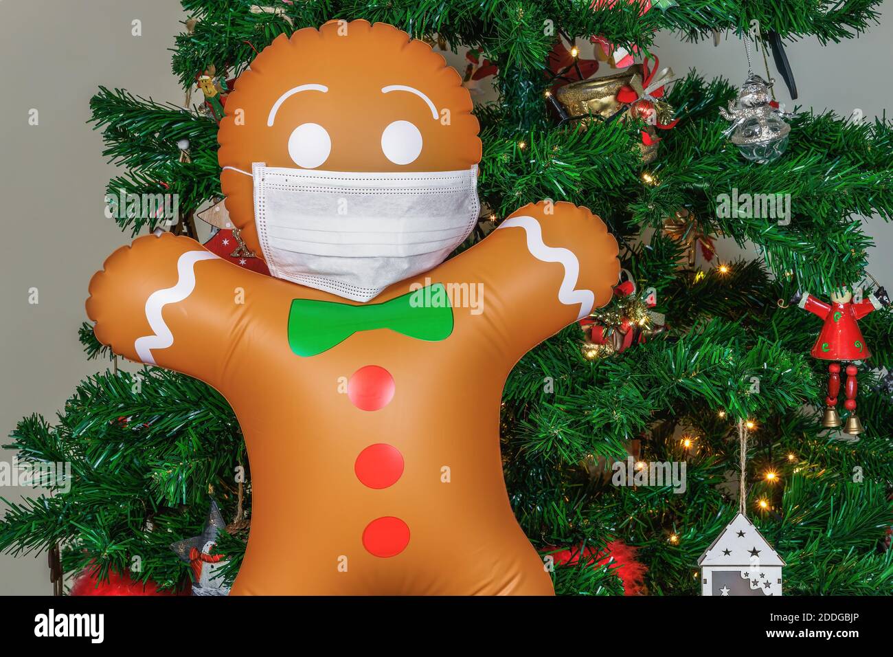 Large Inflatable Cookie Man With Covid 19 Mask As Decoration On Christmas Tree Air Blown Seasonal Gingerbread Figure Before Illuminated Artificial De Stock Photo Alamy